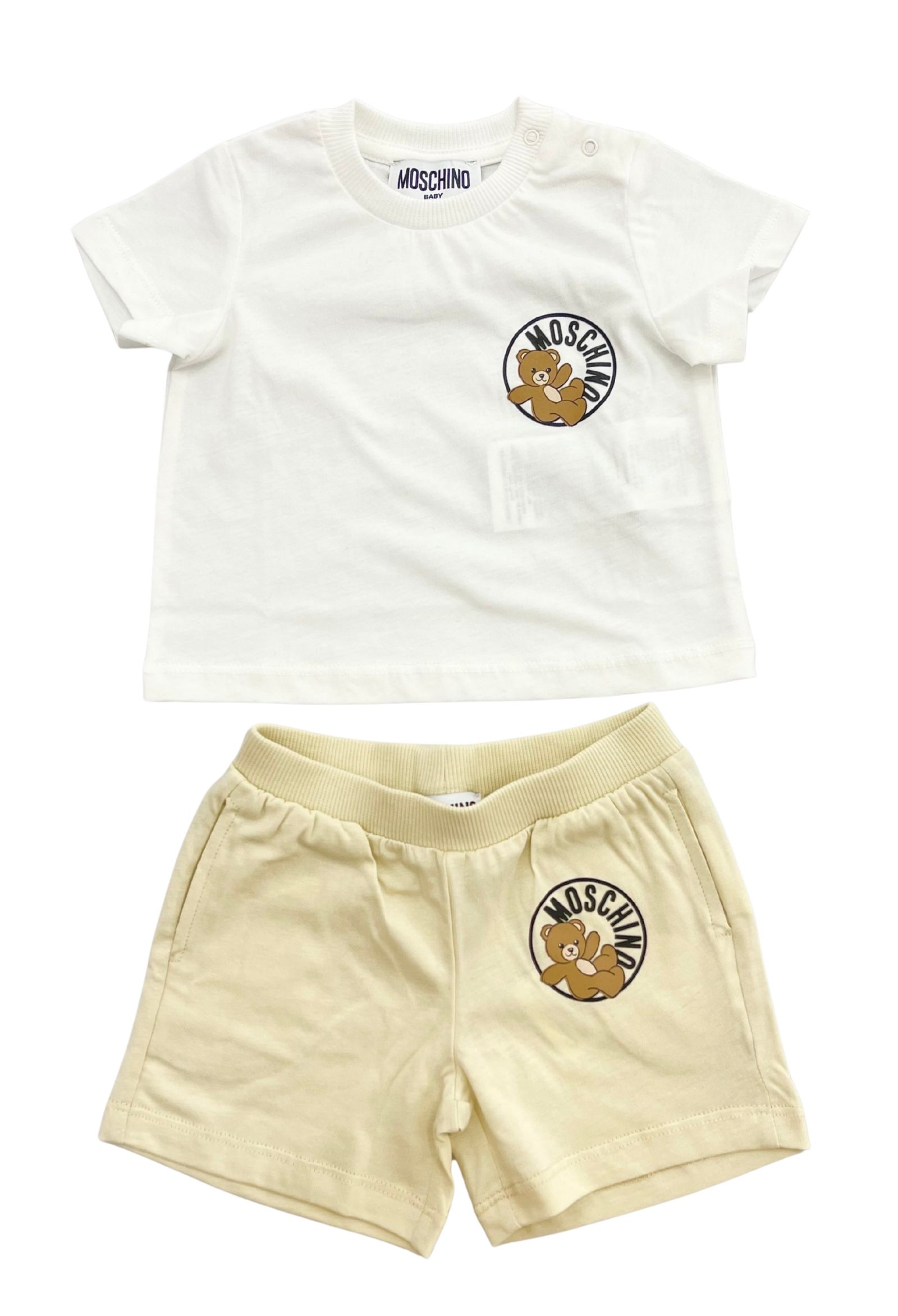 completo Moschinot-shirt bbiancatessuto cotonestampa frontale short coordinato beige con stampa laterale
